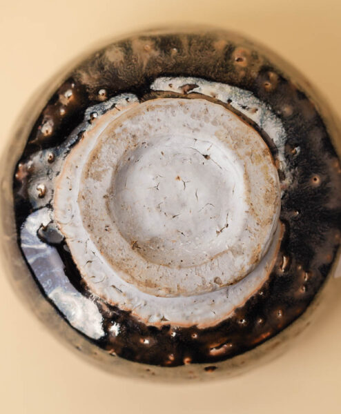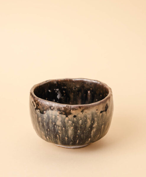 Elegante, klassisch geformte Matchaschale aus dem Hause Hendrik Schöne. Mit ihren 9,5 cm Durchmesser ist sie eher auf der kleineren Seite der Matchaschalen, ist somit aber perfekt für unterwegs geeignet. Die Steinzeug-Schale liegt angenehm schwer in der Hand und durch ihre hohen und dicken Ränder bleibt dein Matcha lang auf Temperatur. Die Tenmoku Glasur glänzt wunderschön metallisch und changiert zwischen Schwarz, Kupfer und Braun.