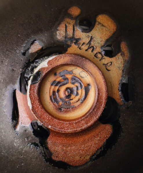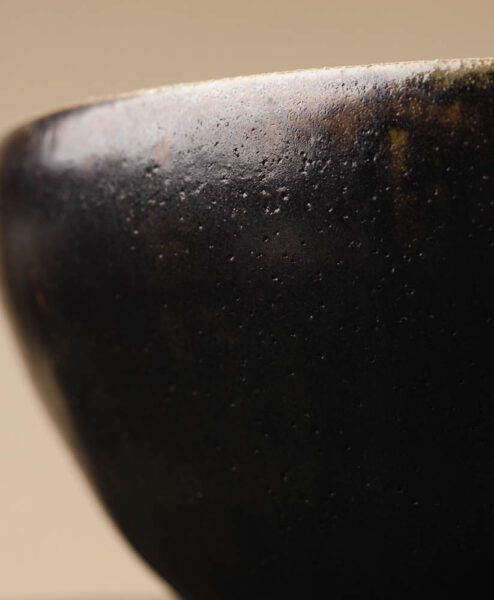 Elegante, klassisch geformte Wan-Nari (jap. 椀形) Matchaschale aus dem Hause Hendrik Schöne. Durch das Gewicht der Steinzeugschale liegt sie perfekt in der Hand und ist ein Garant für den perfekten Matchagenuss. Neben der angenehm glatten Oberfläche der Schale begeistert sie vor allem durch ihre wunderschöne mattschwarze Feldspatglasur. Das tiefe Schwarz entstand dabei nach der Hiki Dashi Methode, bei der die Schale glühendheiß aus dem Holzbrandofen genommen wird und an der Luft bzw. im Wasser sofort abkühlt. Das Schwarz changiert dabei in einem warmen Ton und am Schalenrand reißt die tiefe Schwärze sogar vereinzelt auf und lässt Raum für ein helles Braun.