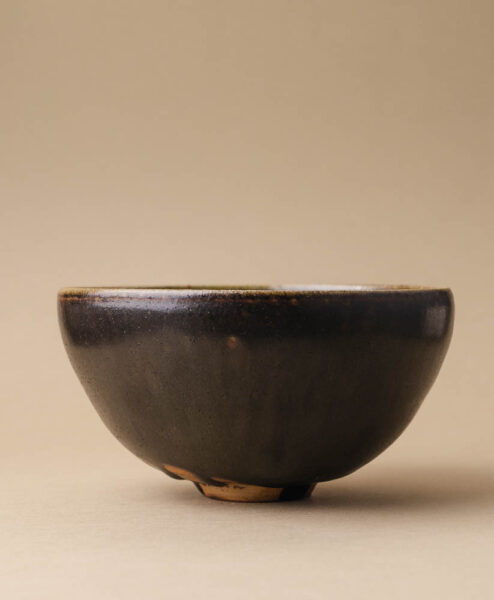Elegante, klassisch geformte Wan-Nari (jap. 椀形) Matchaschale aus dem Hause Hendrik Schöne. Durch das Gewicht der Steinzeugschale liegt sie perfekt in der Hand und ist ein Garant für den perfekten Matchagenuss. Neben der angenehm glatten Oberfläche der Schale begeistert sie vor allem durch ihre wunderschöne mattschwarze Feldspatglasur. Das tiefe Schwarz entstand dabei nach der Hiki Dashi Methode, bei der die Schale glühendheiß aus dem Holzbrandofen genommen wird und an der Luft bzw. im Wasser sofort abkühlt. Das Schwarz changiert dabei in einem warmen Ton und am Schalenrand reißt die tiefe Schwärze sogar vereinzelt auf und lässt Raum für ein helles Braun.
