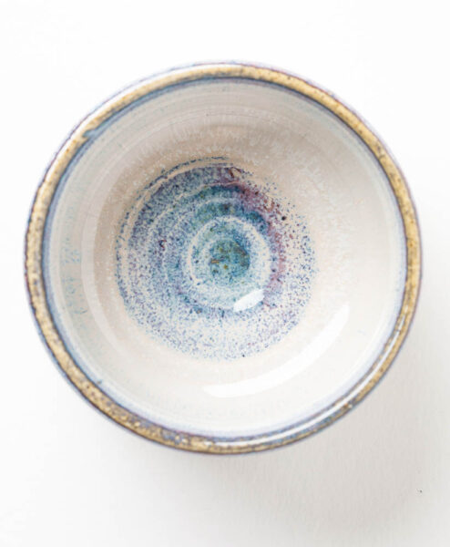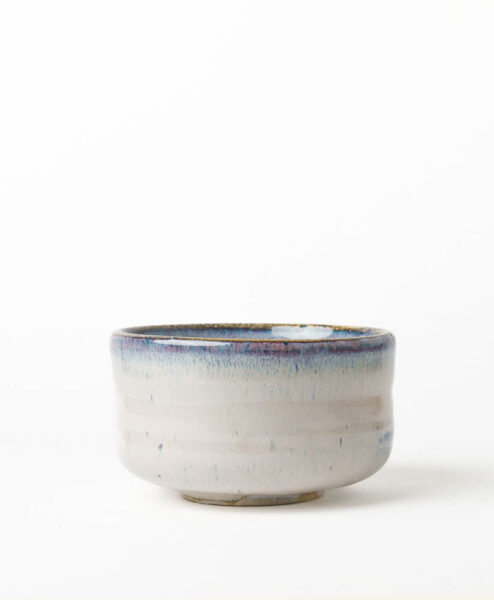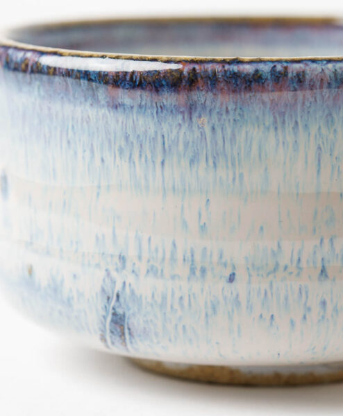 Elegante, klassisch geformte Matchaschale aus dem Hause Hendrik Schöne. Mit ihren 10 cm Durchmesser ist sie eher auf der kleineren Seite der Matchaschalen, ist somit aber perfekt für unterwegs geeignet. Die Steinzeug-Schale liegt angenehm schwer in der Hand und durch ihre hohen und dicken Ränder bleibt dein Matcha lang auf Temperatur. Die Titan Glasur leuchtet wunderschön hell im Licht und die blauen und lila-farbenen Details ziehen dich sofort in ihren Bann.