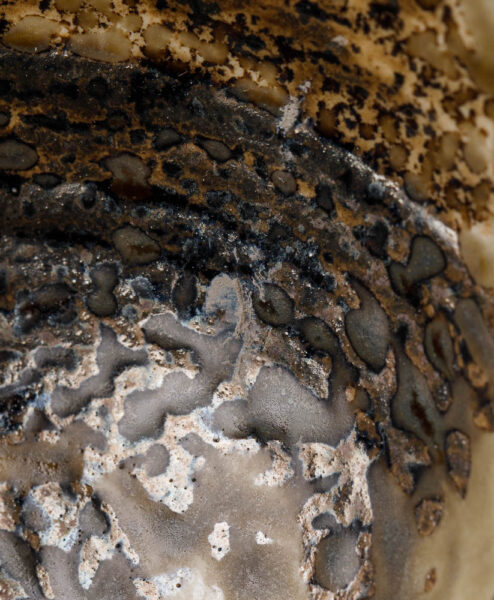 Die Glasur entfaltet ein faszinierendes Spiel aus erdigen Tönen, glänzenden Reflexen und dunklen Einschlüssen. In ihrer Tiefe erinnert sie an versteinertes Holz, an Lavagestein oder an die Schattenspiele eines Waldes – rau und zugleich geheimnisvoll schimmernd. Jeder Blickwinkel offenbart neue Details: matte Strukturen, glänzende Ströme, fließende Übergänge.