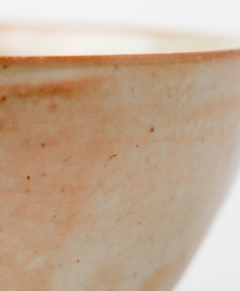 Elegante, klassisch geformte Wan-Nari (jap. 椀形) Matchaschale aus dem Hause Hendrik Schöne. Durch das Gewicht der Steinzeugschale liegt sie perfekt in der Hand und ist ein Garant für den perfekten Matchagenuss. Neben der angenehm glatten Oberfläche der Schale begeistert sie vor allem durch ihre wunderschöne Shino-Glasur, die hier ein besonders kräftiges und abwechslungsreiches Orangerot angenommen hat. Das ganze wird durch den Creme-Ton der Shino-Glasur harmonisch abgerundet. Spannend wird es dann allerdings im Inneren der Schale, denn da findest Du vereinzelte blaue Sprenksel, die sowohl das Auge und als auch den Geist beschäftigen.