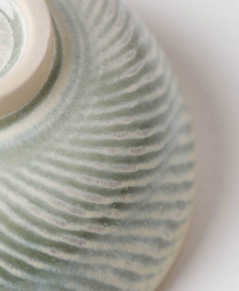 Der 1957 in Münster geborene Berthold Neumann studierte zu erst Chemie, bevor er sein Kunststudium mit dem Schwerpunkt Keramik in München absolvierte. Danach betrieb er Werkstätten in Kiel und in Emmendingen bis er sich 1996 in Jestetten/Baden-Württemberg niederließ und seine Werkstatt-Atelier „Die Schale“ eröffnete. Berthold Neumann hat seine ganz eigene Art entwickelt mit Ton zu arbeiten. Das beginnt schon mit der Herstellung der Tonmasse, denn diese wird in einem aufwendigen Verfahren über mehrere Monate hinweg, gereinigt und aufgearbeitet, um einen makellose Ausgangsmasse zu haben. Im Anschluss dreht Neumann seine Teeschalen auf der Drehscheibe und nachdem sie lederhart ausgetrocknet sind, wird die Oberfläche von Neumann mit entsprechenden Werkzeugen strukturiert. Dadurch entstehen oft, wellen- oder spiralförmige Muster, die durch die besonderen Glasuren noch betont werden. Beim Betrachten der einzigartigen Teeschalen von Berthold Neumann breitet sich eine innere Ruhe aus, denn die faszinierenden, oft türkis-farbenen oder beigen, Glasuren, ziehen dich mit ihrem Detailreichtum in den Bann.