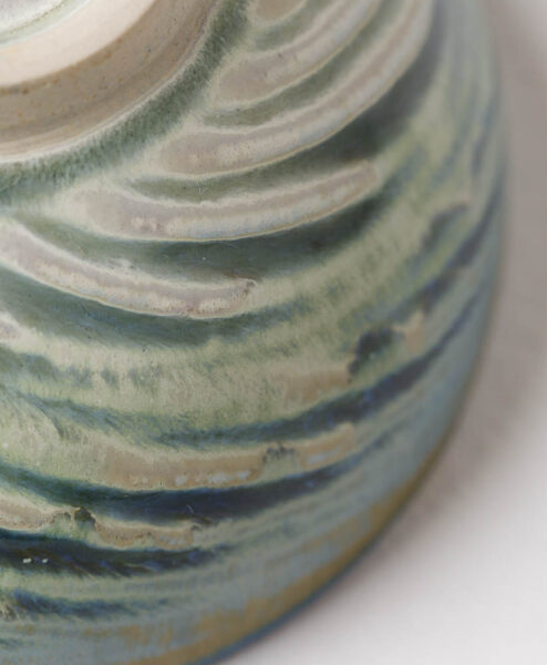Der 1957 in Münster geborene Berthold Neumann studierte zu erst Chemie, bevor er sein Kunststudium mit dem Schwerpunkt Keramik in München absolvierte. Danach betrieb er Werkstätten in Kiel und in Emmendingen bis er sich 1996 in Jestetten/Baden-Württemberg niederließ und seine Werkstatt-Atelier „Die Schale“ eröffnete. Berthold Neumann hat seine ganz eigene Art entwickelt mit Ton zu arbeiten. Das beginnt schon mit der Herstellung der Tonmasse, denn diese wird in einem aufwendigen Verfahren über mehrere Monate hinweg, gereinigt und aufgearbeitet, um einen makellose Ausgangsmasse zu haben. Im Anschluss dreht Neumann seine Teeschalen auf der Drehscheibe und nachdem sie lederhart ausgetrocknet sind, wird die Oberfläche von Neumann mit entsprechenden Werkzeugen strukturiert. Dadurch entstehen oft, wellen- oder spiralförmige Muster, die durch die besonderen Glasuren noch betont werden. Beim Betrachten der einzigartigen Teeschalen von Berthold Neumann breitet sich eine innere Ruhe aus, denn die faszinierenden, oft türkis-farbenen oder beigen, Glasuren, ziehen dich mit ihrem Detailreichtum in den Bann.