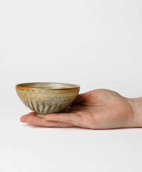 Der 1957 in Münster geborene Berthold Neumann studierte zu erst Chemie, bevor er sein Kunststudium mit dem Schwerpunkt Keramik in München absolvierte. Danach betrieb er Werkstätten in Kiel und in Emmendingen bis er sich 1996 in Jestetten/Baden-Württemberg niederließ und seine Werkstatt-Atelier „Die Schale“ eröffnete. Berthold Neumann hat seine ganz eigene Art entwickelt mit Ton zu arbeiten. Das beginnt schon mit der Herstellung der Tonmasse, denn diese wird in einem aufwendigen Verfahren über mehrere Monate hinweg, gereinigt und aufgearbeitet, um einen makellose Ausgangsmasse zu haben. Im Anschluss dreht Neumann seine Teeschalen auf der Drehscheibe und nachdem sie lederhart ausgetrocknet sind, wird die Oberfläche von Neumann mit entsprechenden Werkzeugen strukturiert. Dadurch entstehen oft, wellen- oder spiralförmige Muster, die durch die besonderen Glasuren noch betont werden. Beim Betrachten der einzigartigen Teeschalen von Berthold Neumann breitet sich eine innere Ruhe aus, denn die faszinierenden, oft türkis-farbenen oder beigen, Glasuren, ziehen dich mit ihrem Detailreichtum in den Bann.