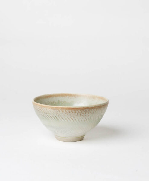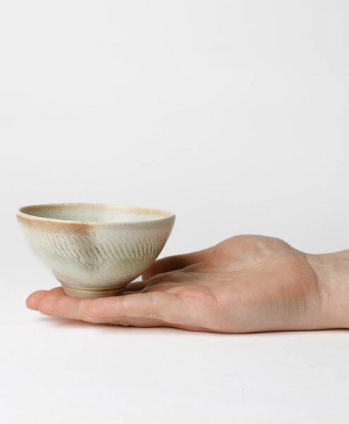 Der 1957 in Münster geborene Berthold Neumann studierte zu erst Chemie, bevor er sein Kunststudium mit dem Schwerpunkt Keramik in München absolvierte. Danach betrieb er Werkstätten in Kiel und in Emmendingen bis er sich 1996 in Jestetten/Baden-Württemberg niederließ und seine Werkstatt-Atelier „Die Schale“ eröffnete. Berthold Neumann hat seine ganz eigene Art entwickelt mit Ton zu arbeiten. Das beginnt schon mit der Herstellung der Tonmasse, denn diese wird in einem aufwendigen Verfahren über mehrere Monate hinweg, gereinigt und aufgearbeitet, um einen makellose Ausgangsmasse zu haben. Im Anschluss dreht Neumann seine Teeschalen auf der Drehscheibe und nachdem sie lederhart ausgetrocknet sind, wird die Oberfläche von Neumann mit entsprechenden Werkzeugen strukturiert. Dadurch entstehen oft, wellen- oder spiralförmige Muster, die durch die besonderen Glasuren noch betont werden. Beim Betrachten der einzigartigen Teeschalen von Berthold Neumann breitet sich eine innere Ruhe aus, denn die faszinierenden, oft türkis-farbenen oder beigen, Glasuren, ziehen dich mit ihrem Detailreichtum in den Bann.