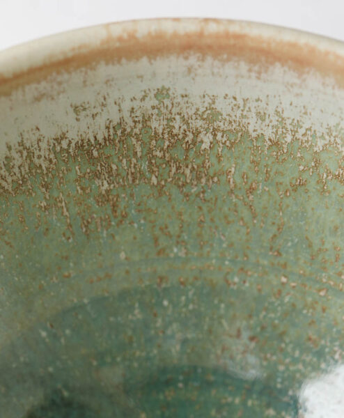 Mittelgroße, beige-creme-farbene mit grünen Akzenten versetzte Teeschale aus dem Hause Berthold Neumann. Die Teeschale kommt in einer klassischen Wan-Nari-Form und liegt mit ihrer Form besonders gut in der Hand. Die Tonmasse hält die Temperatur des Tees zuverlässig und gibt die Wärme sanft an deine Haut ab. Die faszinierende Glasur erhält die Schale durch ein 2-Glasuren-Verfahren, welches auf für die seidenmatte Oberfläche verantwortlich ist. Die sanfte Struktur erinnert an Strandtage im Herbst, wo die See grün schimmert und der Wind sanft-stürmisch über die Dünen weht. Das klare Grün-Blau im Inneren der Teeschale zieht dich sofort in seinen Bann.