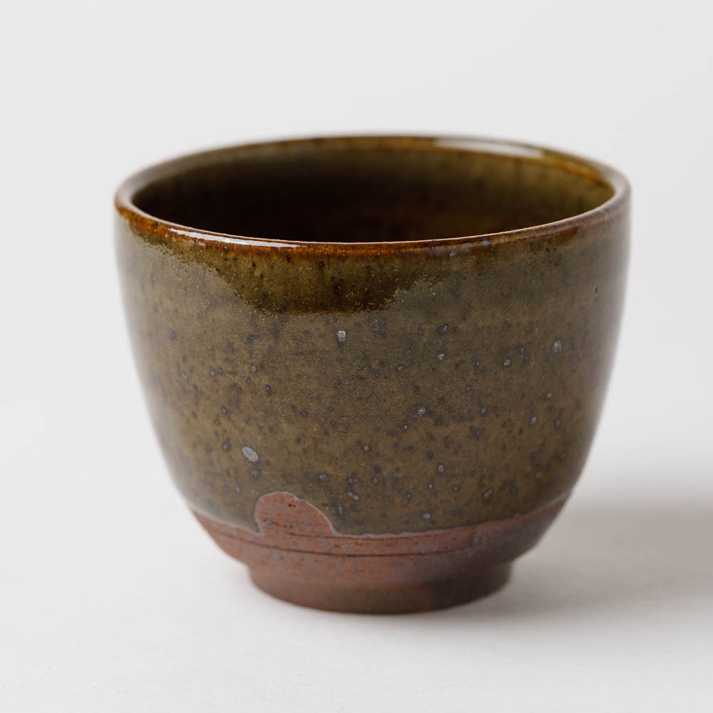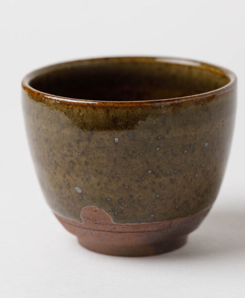 Ein warmer Olivton dominiert die Oberfläche dieser Schale und wird von feinen, helleren Sprenkeln belebt. Am Rand und im Inneren treten orangebraune Nuancen hervor, die dem Ganzen eine subtile Tiefe verleihen. Die Teeschale ist in einer kompakten, stabilen Form gearbeitet, die angenehm in der Hand liegt und Wärme lange speichert. Die Glasur verstärkt die organische Ausstrahlung und lädt zum bewussten Genießen ein.