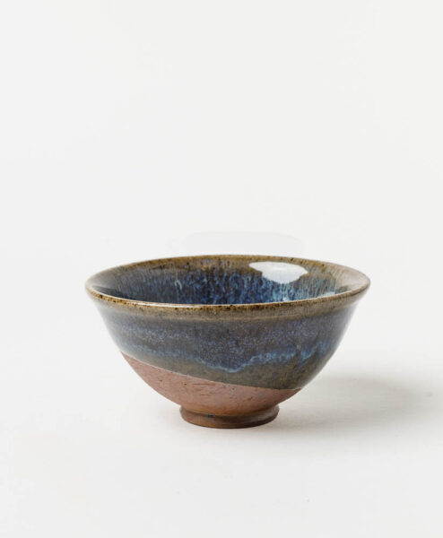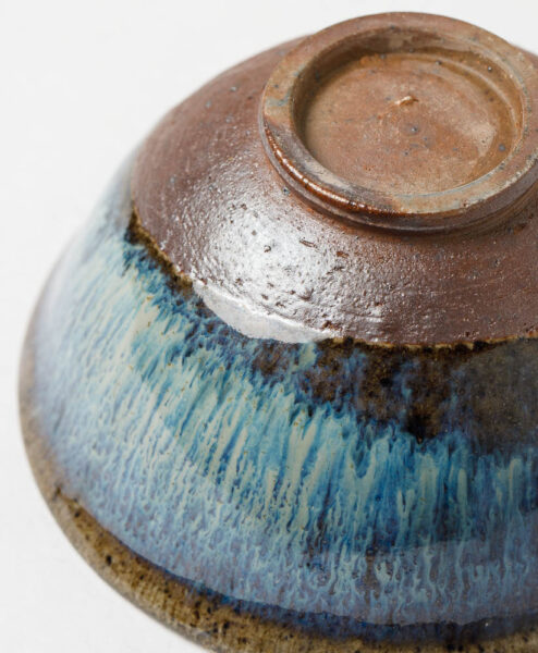 Der braunwarme Ton wird von einer stimmungsvollen Glasur überzogen, die in einer Vielzahl von Blautönen leuchtet. Es ist eine sehr dynamische Glasur, die wie ein kleines Naturgemälde in Keramikform aussieht. Die Teeschale selbst kommt in einer klassichen Hiragata-Form, welche sich besonders durch ihre flache und breitauslaufende Form definiert. Die Glasur verleiht der Oberfläche Tiefe und Dynamik, während die Form Klarheit und Funktionalität betont.