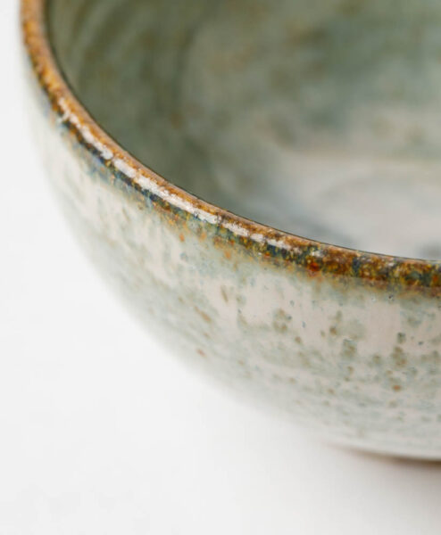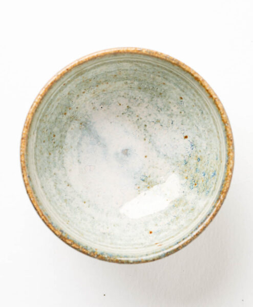 Kleine Teeschale aus dem Hause Hendrik Schöne. Die Teeschale ist ein echter Hingucker. Sie kommt in einer klassischen Wan-Nari-Form und liegt mit der natürlichen Schwere des Steinzeugs besonders gut in der Hand. Das Highlight der Teeschale ist allerdings seine wunderschöne Titan-Glasur. Diese reagierte während des Brands mit der Steinzeugmaße und entwickelte dabei die wunderbar sanften Grüntöne. Diese verschmelzen mit den Braun-, Blau- und Cremetönen zu einem detailreichen Augenschmaus.