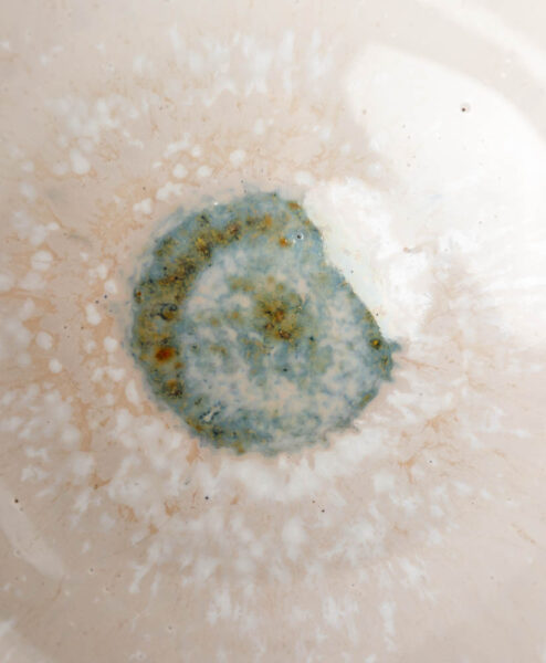 Mittelgroße Teeschale aus dem Hause Hendrik Schöne. Die Teeschale ist ein echter Hingucker. Sie kommt in einer klassischen Wan-Nari-Form und liegt mit der natürlichen Schwere des Steinzeugs besonders gut in der Hand. Das Highlight der Teeschale ist allerdings seine wunderschöne Titan-Glasur. Gekonnt wechseln sich Grün-, Blau-, Creme- und Gelbtöne in den spannendsten Formen ab und verschmelzen zu einem detailreichen Augenschmaus.