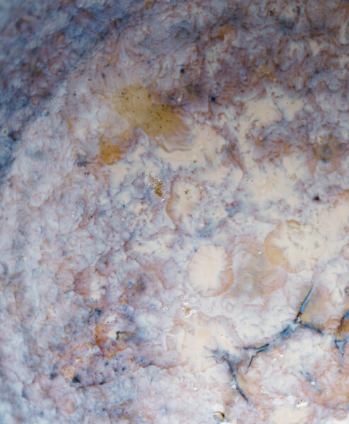 Mittelgroße Teeschale aus dem Hause Hendrik Schöne. Die Teeschale ist ein echter Hingucker. Sie kommt in einer klassischen Wan-Nari-Form und liegt mit der natürlichen Schwere des Steinzeugs besonders gut in der Hand. Das Highlight der Teeschale ist allerdings seine wunderschöne Glasur. Der Holzofenbrand verwandelte, die von Hendrik Schöne selbst gemischte Titanglasur. Gekonnt wechseln sich Lila-, Blau-, Gelb- und Cremetöne in den spannendsten Formen ab und verschmelzen zu einem detailreichen Augenschmaus.