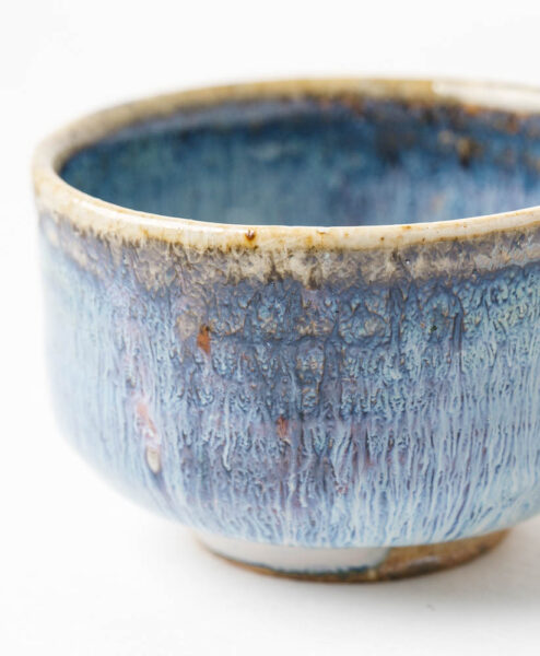Kleine Teeschale aus dem Hause Hendrik Schöne. Die Teeschale ist ein echter Hingucker. Sie kommt in einer klassischen Han-Tsutsu-Gata-Form und liegt mit der natürlichen Schwere des Steinzeugs besonders gut in der Hand. Das Highlight der Teeschale ist allerdings seine wunderschöne Titan-Glasur. Gekonnt wechseln sich Lila-, Blau-, Gelb- und Cremetöne in den spannendsten Formen ab und verschmelzen zu einem detailreichen Augenschmaus.