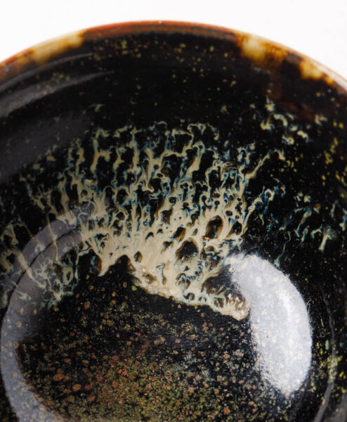 Die Glasur entfaltet ein faszinierendes Spiel aus einem unendlich erscheinenden Schwarz und faszinierenden Blau- Beige- und Weißtönen.