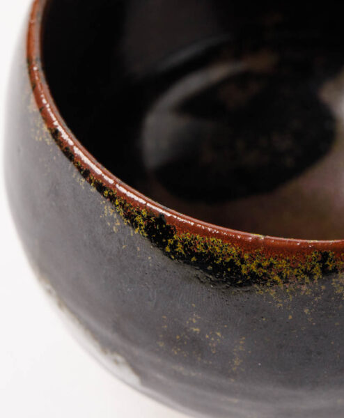 Die tiefschwarze Glasur wird durch goldene und rötliche Sprenkel durchbrochen – wie ein nächtlicher Sternenhimmel, der in der Stille aufleuchtet. Jeder Blick in die Schale wirkt wie ein Blick in den Kosmos – ruhig, weit und lebendig zugleich.