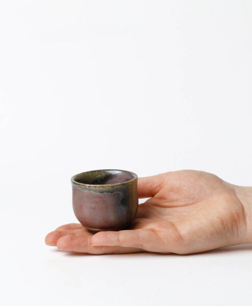 Harmonische, klassisch geformte kleine Teeschale von Zhi Ming Xie. Die Holzbrandglasur verbindet Moosgrün mit kupfernen Reflexen, die bei Lichteinfall aufleuchten. Die Oberfläche zeigt eine spannende Mischung aus matten und glänzenden Bereichen, die sich organisch miteinander verbinden. Jede Schale ist ein Unikat, das die Ruhe des Waldes und die Kraft des Feuers in sich vereint.