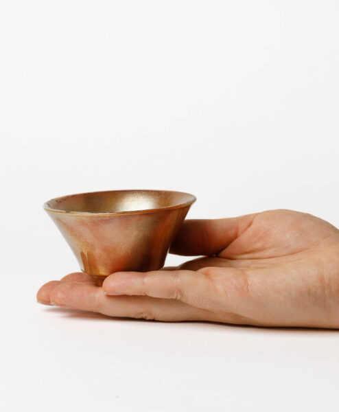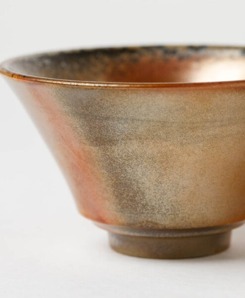 Elegante, klassisch geformte Teeschale vom Taiwanesischen Töpfermeister Zhi Ming Xie. Herr Xies einzigartige Teeschalen erhalten durch den Holzbrand eine ganz eigene Farbgebung, die einen Hauch Metalloptik versprechen. So glänzt die Schale je nach Lichteinfall in einem außergewöhnlichen Kupferton, den man so normalerweise nicht in Keramikgefäßen findet. Neben den munteren Kupfertönen weißt jede Schale von Herrn Xie auch noch einzigartige Holzbrandmuster auf, welche oft eine halb-matte bis matte Oberfläche haben. So entsteht ein spannender Texturenmix, der jede Schale zu einem echten Unikat macht.