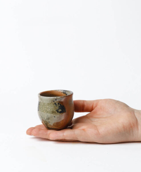 Ausdrucksstarke Teeschale in klassischer Form aus der Werkstatt von Berthold Neumann. Die Holzbrandglasur vereint rostige Rot- und Olivtöne mit bläulichen Eisenreflexen, die in unterschiedlichem Licht neue Facetten zeigen. Die Oberfläche wechselt zwischen matten und glänzenden Partien und verleiht der Schale eine lebendige, handwerkliche Ausstrahlung.