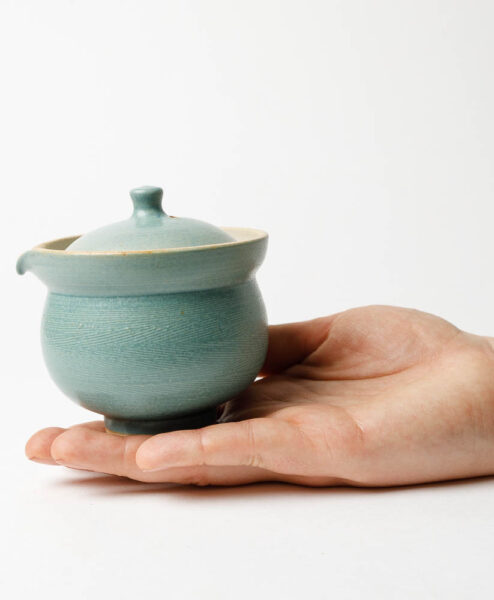 Diese grifflose, japanische Kanne (= Shiboridashi) ist ein Unikat des tschechischen Keramikkünstlers Aleš Dančák, der überwiegend an der Töpferscheibe arbeitet. Die blaue Glasur schmeichelt dank ihrer samtigen Oberfläche nicht nur Deiner Hand, sondern erleichtert auch das Abgießen Deines Tees dank der kleinen Löcher im Deckel.