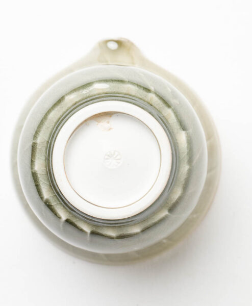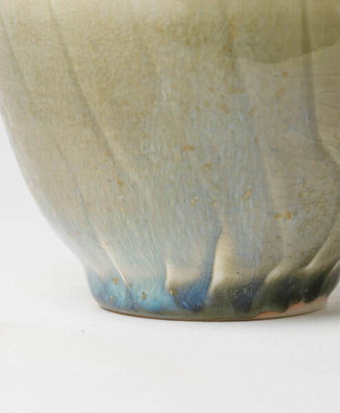 Diese grifflose, japanische Kanne (= Shiboridashi) ist ein Unikat des tschechischen Keramikkünstlers Aleš Dančák, der überwiegend an der Töpferscheibe arbeitet. Die grüne Glasur schmeichelt dank ihrer glatten Oberfläche nicht nur Deiner Hand, sondern erleichtert auch das Abgießen Deines Tees dank der kleinen Löcher im Deckel. Ein besonderer Hingucker ist die ins Blau changierende Glasur am Fuss der Schale .