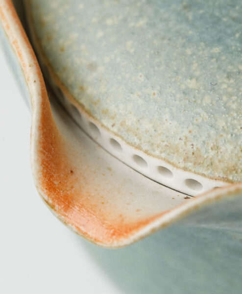 Diese grifflose, japanische Kanne (= Shiboridashi) ist ein Unikat des tschechischen Keramikkünstlers Aleš Dančák, der überwiegend an der Töpferscheibe arbeitet. Die grün-blau Glasur schmeichelt dank ihrer glatten Oberfläche nicht nur Deiner Hand, sondern erleichtert auch das Abgießen Deines Tees dank der kleinen Löcher im Deckel.