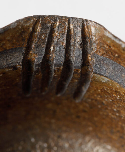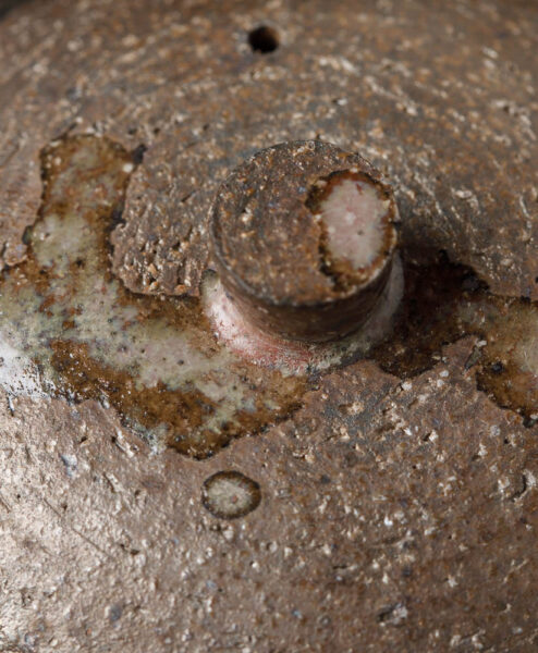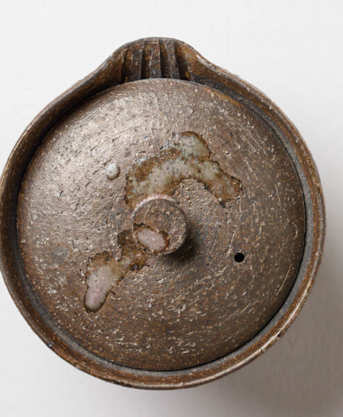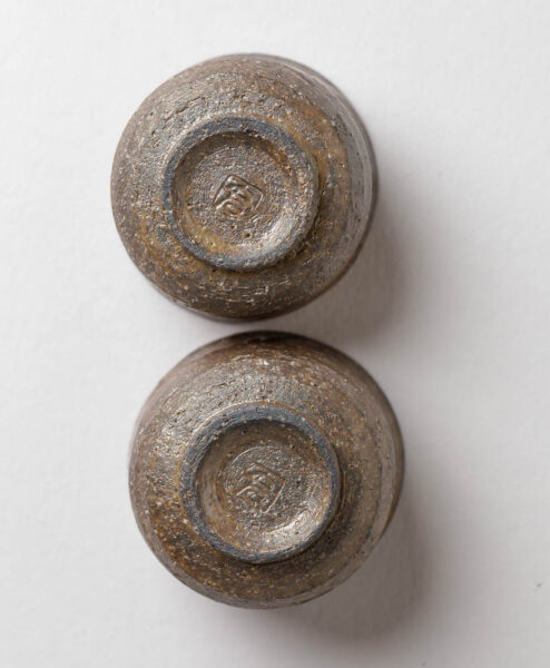Dieses elegante Teeset besteht aus einer unglasierten Shiboridashi (= japanische, grifflose Kanne) und der passenden glasierten Teeschale. Beide Keramikteile stammen von einem japanischen Keramikkünstler, welcher in der Nähe von Kyoto arbeitet. Die Stücke sind ultraleicht und die verwendete, leicht raue Steinzeugmasse ist auch haptisch ein echtes Erlebnis. Die Shiboridashi ist außerdem leicht im Handling, denn der Ausguss und die Rillen am Rand erleichtern das Abgiessen des Tees. Das Innere und Äußere der Shiboridashi ist unglasiert (bis auf durch Asche entstandene Effekt-Glasurteile), dadurch kann das Wasser und der Tee mit der Steinzeugmasse reagieren und hebt dabei bestimmt Aromen hervor. Die Steinzeugmasse hat einen wunderschönen matt-braunen Farbton, welcher an die Rinde von Kiefern errinnert. Die durch Asche entstandene Glasurteile schimmert in den verschiedensten farben und ist ein echter Hingucker.