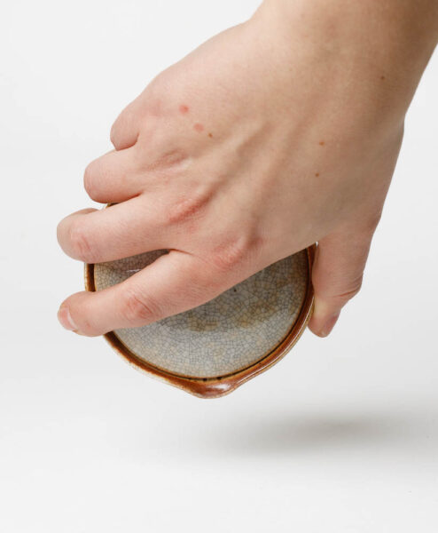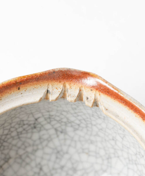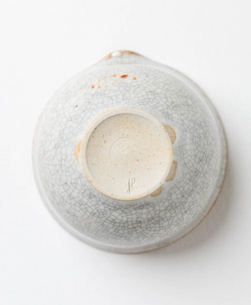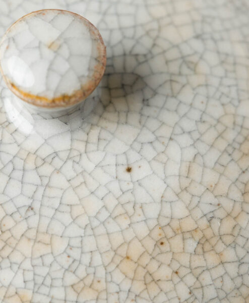 Diese grifflose, japanische Kanne (= Shiboridashi) ist ein Unikat des tschechischen Keramikkünstlers Jiri Lang. Die warme, creme-weiße Kanne mit dem schönen Krakelee-Muster hat ihr markantes Äußeres dem Raku-Holzbrand zu verdanken. Die Shiboridashi ist außerdem leicht im Handling, denn der Ausguss und die Rillen am Rand erleichtern das Abgiessen des Tees.