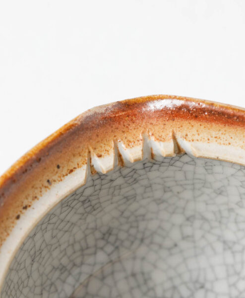 Diese grifflose, japanische Kanne (= Shiboridashi) ist ein Unikat des tschechischen Keramikkünstlers Jiri Lang. Die warme, creme-weiße Kanne mit dem schönen Krakelee-Muster hat ihr markantes Äußeres dem Raku-Holzbrand zu verdanken. Die Shiboridashi ist außerdem leicht im Handling, denn der Ausguss und die Rillen am Rand erleichtern das Abgiessen des Tees.