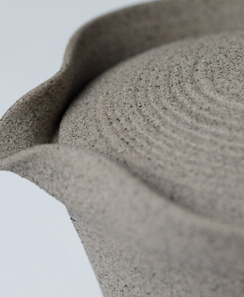 Diese grifflose, japanische Kanne (= Shiboridashi) ist ein Unikat der deutschen Keramikkünstlerin Karina Klages. Die steingraue Kanne ist von Karina mit viel Liebe in Handarbeit entstanden und die verwendete Steinzeugmasse ist auch haptisch ein echtes Erlebnis. Die Shiboridashi ist außerdem leicht im Handling, denn der Ausguss und die Rillen am Rand erleichtern das Abgiessen des Tees. Das Innere und Äußere der Shiboridashi ist unglasiert, dadurch kann das Wasser und der Tee mit der Steinzeugmasse reagieren und hebt dabei bestimmt Aromen hervor.