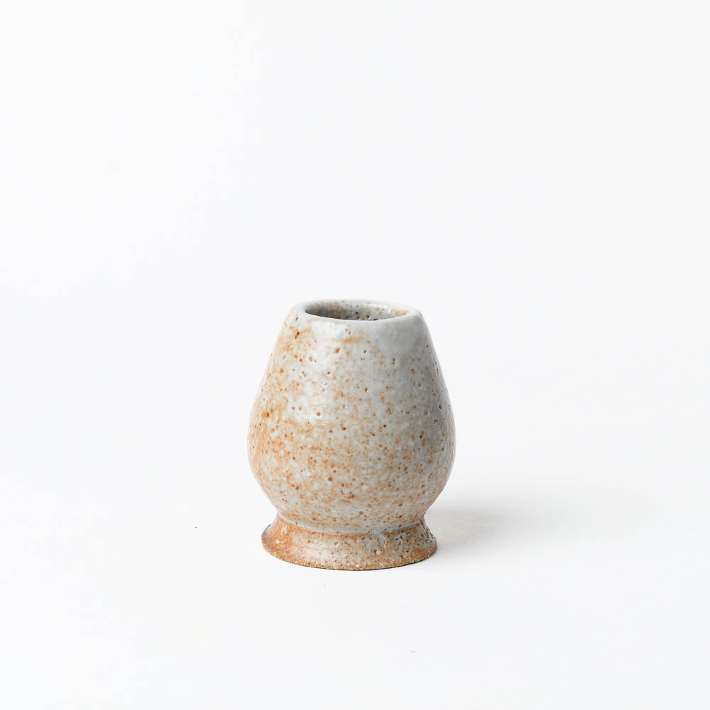 Herkömmliche Chasenhalter sind dir zu eintönig? Dann wirst du mit diesen Einzelstücken von Hendrik Schöne sicher auf deine Kosten kommen. Hendrik hat den Matchabesenhalter (auch Chasentate) aus Steinzeugmassen und auf der Drehscheibe gefertigt. Somit ist jedes Stück ein absolutes Unikat, in dem vor allem viel Liebe zum Detail steckt. Während man am Boden noch das raue Material spüren kann, wird es am Körper von einer orange-cremefarbenen Shino Glasur bedeckt, die durch organische Ascheanflug-Details ergänzt wird. Gib deinem Matchabesen jetzt ordentlichen Halt und schütze so seine Form.
