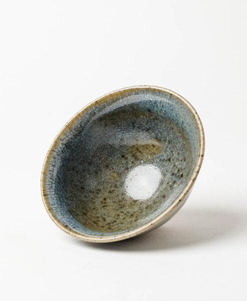 Der braunwarme Ton wird von einer stimmungsvollen Glasur überzogen, die in einer Vielzahl von Blau- und Grüntönen leuchtet. Die Teeschale selbst kommt in einer klassichen Hiragata-Form, welche sich besonders durch ihre flache und breitauslaufende Form definiert. Die Glasur verleiht der Oberfläche Tiefe und Dynamik, während die Form Klarheit und Funktionalität betont.
