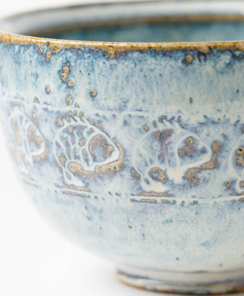 Mittelgroße Teeschale aus dem Hause Hendrik Schöne. Die Teeschale ist ein echter Hingucker. Sie kommt in einer klassischen Wan-Nari-Form und liegt mit der natürlichen Schwere des Steinzeugs besonders gut in der Hand. Das Highlight der Teeschale ist allerdings seine wunderschöne Glasur und Textur. Gekonnt wechseln sich Blau- und Cremetöne in den spannendsten Formen ab und verschmelzen zu einem detailreichen Augenschmaus. Ergänzt wird diese Eleganz durch eine passende Fisch-Texture, die diese Schale zum absoluten Hingucker macht.
