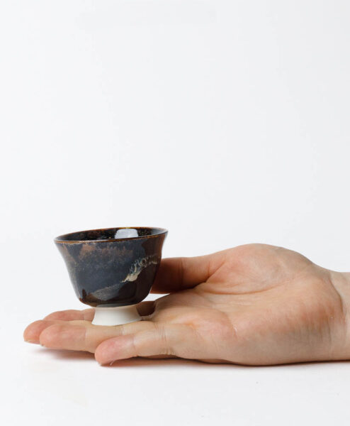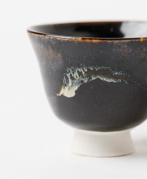 Kraftvoll und frei wirkt diese kleine Teeschale, als trage sie den Nachhall einer Sternennacht in sich. Die dunkel grundierte Glasur ist durchzogen von hellen Sprenkeln und fließenden Bahnen, die wie der Schweif eines Kometen über den Nachthimmel ziehen. Die organische Form liegt angenehm in der Hand und lädt zu Teemomenten ein, die wie Sternschnuppen in Erinnerung bleiben.