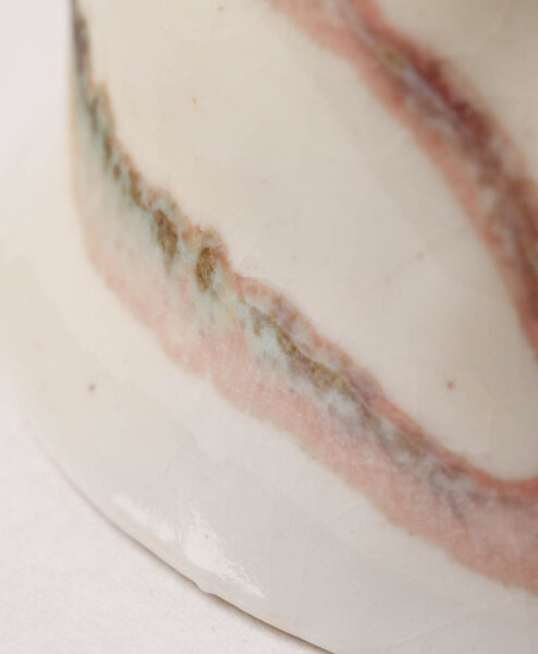 Die Glasur entfaltet ein faszinierendes Spiel aus der hellen Grundmasse und den kontrastierenden Farbspritzern. So entsteht eine lebendige, fast verspielte Optik.